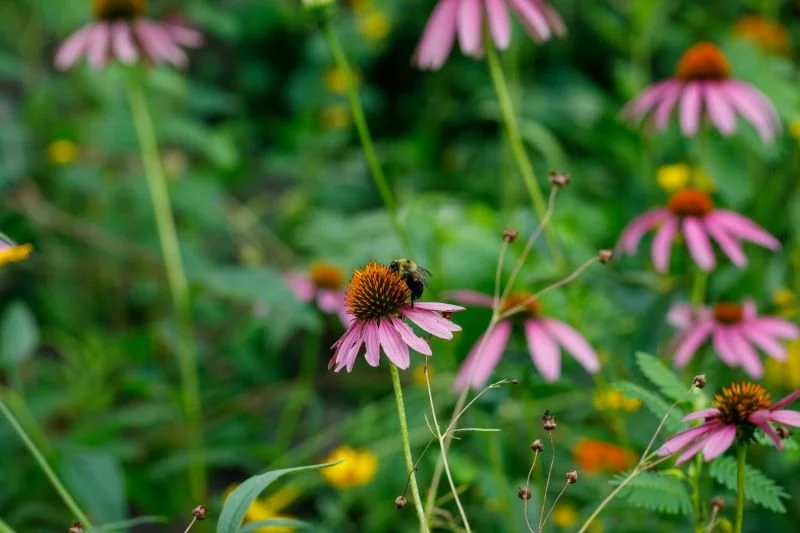 A bumblebee enjoys a native plant buffet in an Our Land Organics client’s landscape